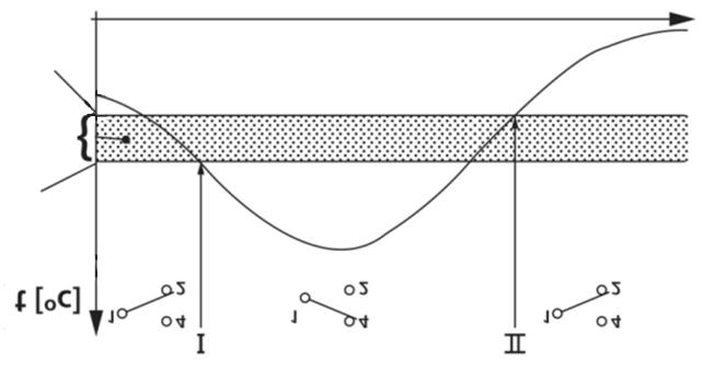 當(dāng)溫度升至設(shè)定范圍帶上限時(shí),觸點(diǎn)1-2斷開(kāi),同時(shí)觸點(diǎn)1-4閉合。同理,當(dāng)溫度降至范圍帶下限時(shí),觸點(diǎn)1-4斷開(kāi),同時(shí)觸點(diǎn)1-2閉合。如圖示: